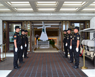 九、保安員上崗必須按規(guī)定著裝,佩戴標(biāo)志和裝備器械,做到衣著整潔、精神飽滿、形象莊重。